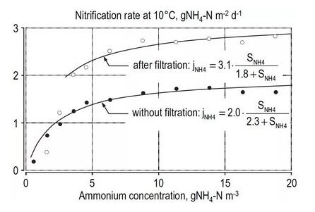 活性污泥工藝的硝化菌表面莫諾飽和系數(shù)大于MBR系統(tǒng)。但是Manser等人認(rèn)為對(duì)于這個(gè)差別可以由傳質(zhì)作用解釋:活性污泥的絮體要比MBR的大,更長(zhǎng)的擴(kuò)散路徑導(dǎo)致更大的表面飽和值,因此這些動(dòng)力學(xué)參數(shù)跟系統(tǒng)特性相關(guān)的。
