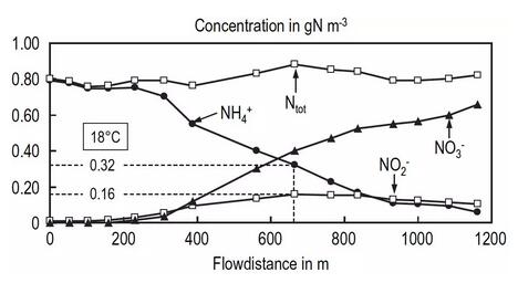 Gujer教授強(qiáng)調(diào),僅僅能夠預(yù)測(cè)污水的硝化表現(xiàn)是不夠的,更重要的是要弄清出水中氮的最終去向。下圖展示的是某富營(yíng)養(yǎng)化湖泊的厭氧出水排入一條小溪后,其中的氮轉(zhuǎn)化達(dá)到接近靜態(tài)的所需距離。我們需要充足的空間才能發(fā)現(xiàn)自然凈化的數(shù)據(jù)。