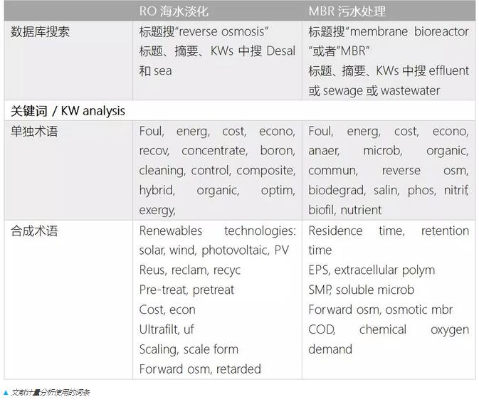 在分析膜技術的研究趨勢方面,Simon Judd教授使用下表的文獻計量分析方法對RO海水淡化和MBR污水處理的關鍵詞進行了搜索統(tǒng)計。