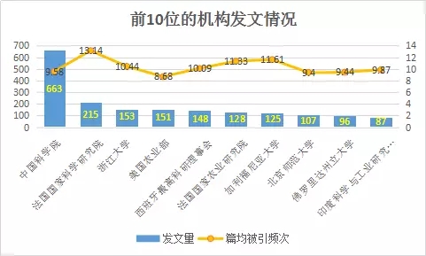圖3 全球土壤污染防治發(fā)文量位居前10位的機構發(fā)文情況(2012-2016年)