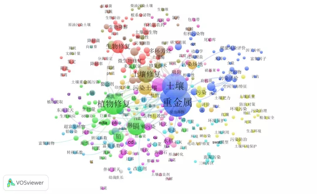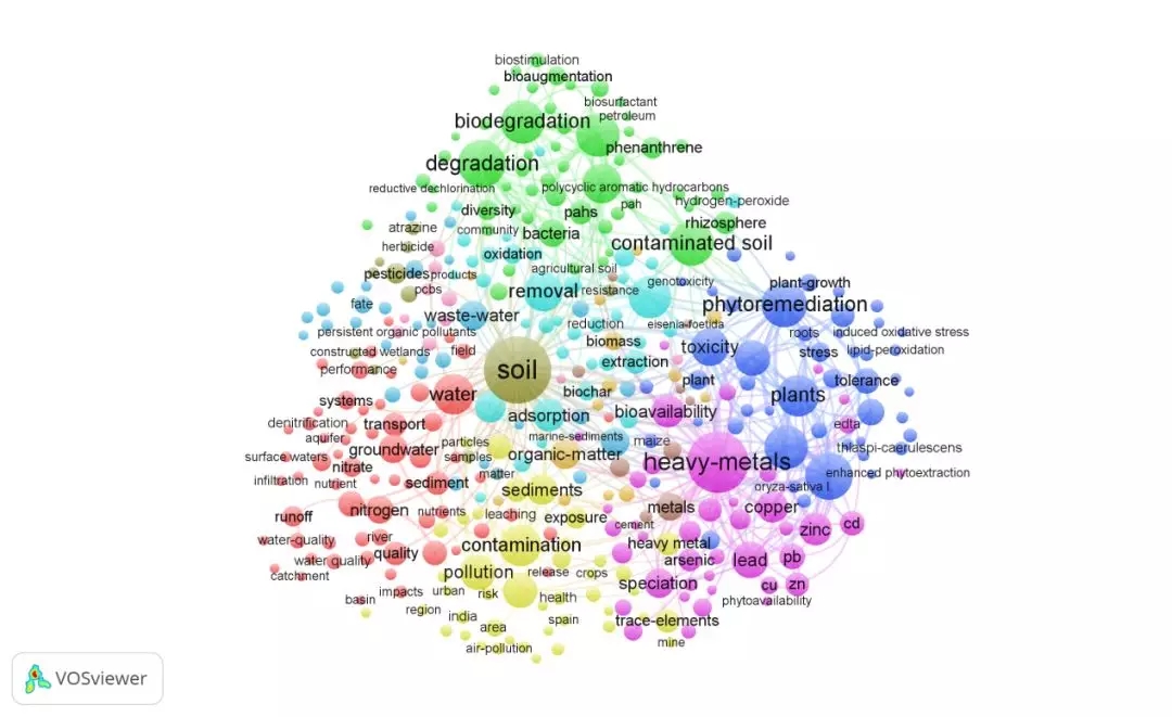 將web of science 上檢索到的9323條英文數(shù)據導入VOSviewer,共分析了491個關鍵詞,得出的高頻關鍵詞見表3。據統(tǒng)計,soil(土壤),heavy-metals(重金屬),出現(xiàn)頻次最高,可見重金屬的污染防治一直是領域的關注重點。degradation(退化)排名第四,反映出近5年來土壤退化問題備受關注。此外,植物修復和微生物修復也是近來的研究熱點。