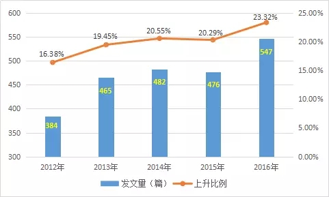 圖2土壤污染防治相關研究歷年發(fā)文趨勢(2012-2016)