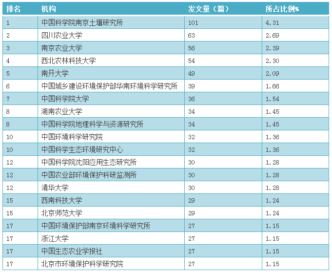 表5 我國土壤污染防治論文數(shù)量排名前20位機構的發(fā)文情況(2012-2016年)