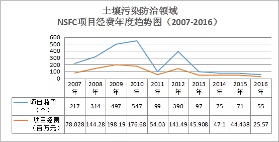通過統(tǒng)計2007-2016十年內我國國家自然科學基金的項目數(shù)據,可知土壤污染防治領域的項目經費在2007-2010年呈穩(wěn)步上升趨勢,2010年申請通過的項目達峰值547個,2011年有所回落,2012年又激增到390個,之后幾年呈現(xiàn)了下降趨勢,2016年僅通過55個項目,經費也隨之下降,如圖9所示。