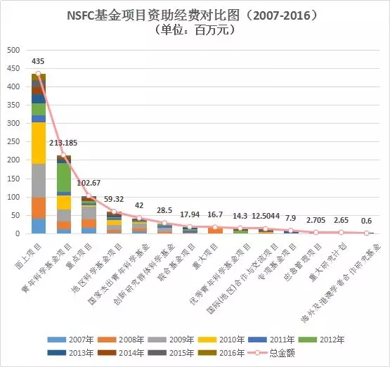 圖10 國家自然科學基金項目資助經費對比圖 (2007-2016年)
