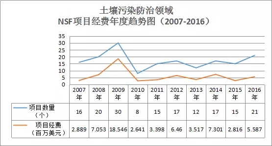 通過項目數(shù)據分析(見圖12),在土壤污染防治領域,美國國家科學基金資助經費在2007年至2009年呈現(xiàn)了穩(wěn)步遞增的趨勢,2009年項目數(shù)量達到峰值30個。2010年出現(xiàn)拐點,項目數(shù)量下降為8個,2011年又開始回升,之后5年一直較為平穩(wěn),2016年有所增加,達到21個。
