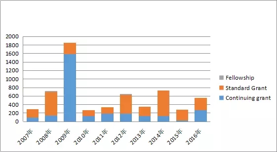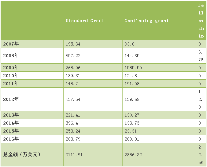 表8 美國國家科學基金項目資助類型經費表(2007-2016年)
