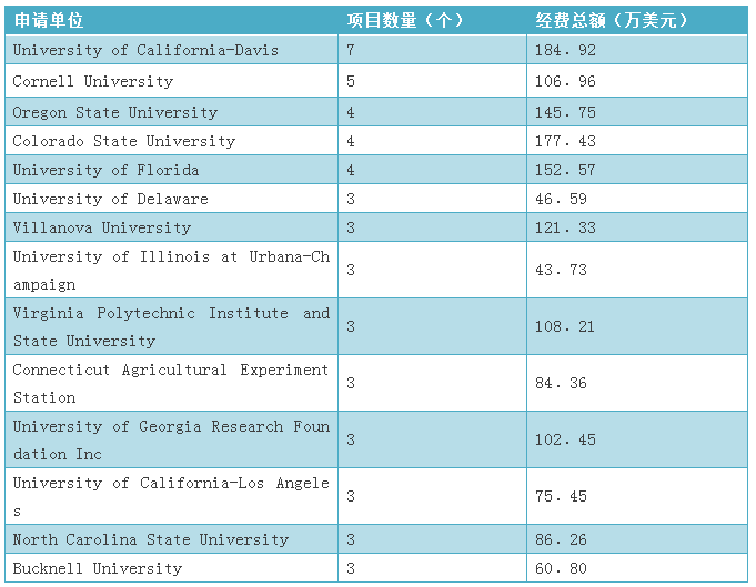 根據統(tǒng)計,本領域申請年份在2007年至2016年間,共有135個機構申請了美國國家科學基金。其中申請數(shù)量超過2個的機構有14個獲得經費約為1496.8萬美元,如表9所示。