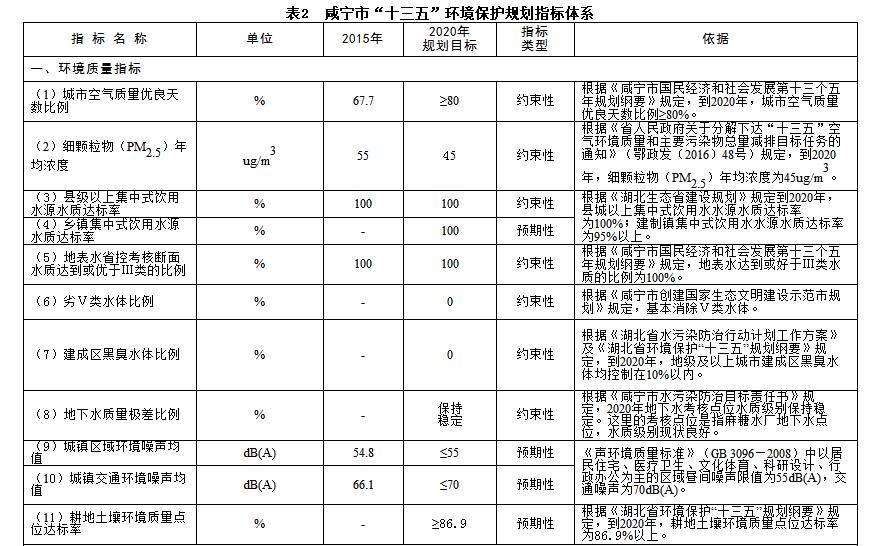 根據(jù)國家、省環(huán)境保護(hù)“十三五”規(guī)劃相關(guān)要求,結(jié)合咸寧實(shí)際情況,“十三五”期間環(huán)保規(guī)劃指標(biāo)如下。