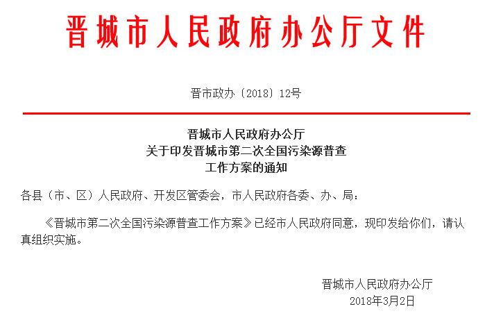 日前山西省晉城市人民政府辦公廳印發(fā)了《 晉城市第二次全國污染源普查工作方案》,全文如下:
