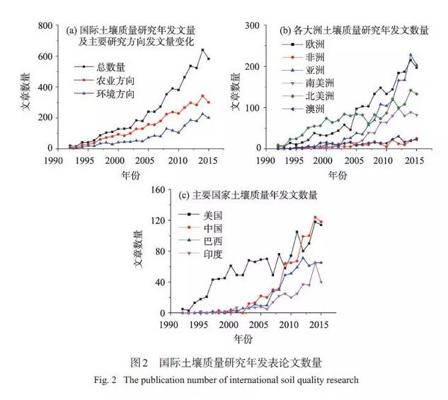 相對于發(fā)達國家,發(fā)展中國家人口眾多,人均資源匱乏,農業(yè)管理也呈現(xiàn)農戶個體經營零碎化,管理方式不一致。而發(fā)達國家機械化大規(guī)模操作,使得農業(yè)的管理趨于一致。從近幾年土壤質量的研究趨勢來看,發(fā)展中國家尤其是中國在其中所占的比例日益增大。隨著全球一體化的快速推進,發(fā)展中國家對糧食安全和環(huán)境保護的訴求也愈加強烈。第十八屆國際土壤學大會指出,將來有兩個主要趨勢:在食物匱乏的國家,只要這種匱乏還存在,土壤科學主要就將致力于解決土壤肥力問題。不幸的是,這種威脅在非洲、亞洲和中南美洲都不斷增長。土壤質量作為環(huán)境質量、糧食安全與經濟問題的紐帶,迎合了發(fā)展中國家的需求。