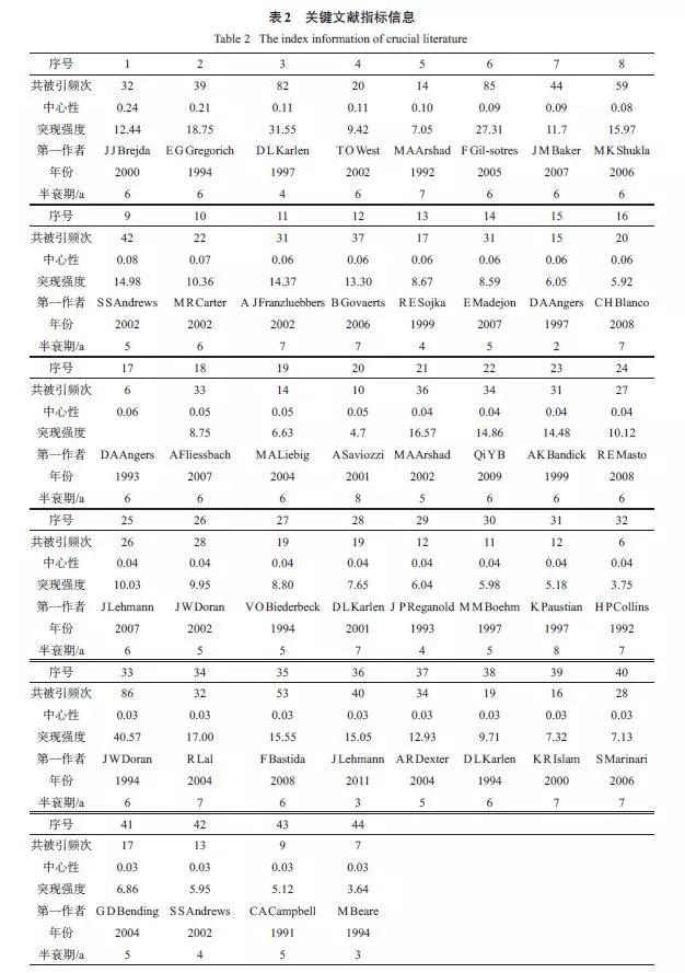 經典文獻都密切關注了文獻發(fā)表時期該領域發(fā)展的熱點問題,因其較高的社會關注度、創(chuàng)新性和系統(tǒng)性,從而引發(fā)其他學者大量引用。通過對44 篇經典文獻內容的分析,2000 年以前多關注農業(yè)管理措施對有機質的影響和土壤質量的概念,2000 年以后,對土壤質量評價方法、評價指標尤其是生物學指標的研究不斷興起,更多地注重土壤質量在農業(yè)和環(huán)境方面的應用,2008 年以來,關于土壤質量與全球氣候變化、土壤修復的關系研究受到更多學者關注。從整個過程來看,土壤質量從概念的產生到廣泛的應用,一直圍繞農業(yè)與環(huán)境的可持續(xù)發(fā)展,這也是人類可持續(xù)發(fā)展的主題之一。