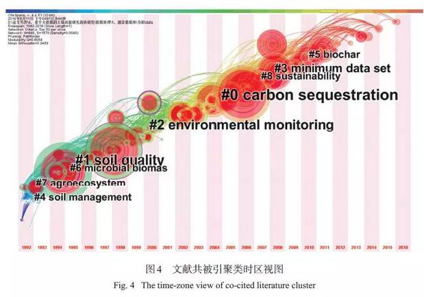 本研究中所認為的“研究主題”是指在一定時段內,眾多學者探討和解決的中心問題,Citespace V通過對文獻共被引的分析,將研究內容相似的文獻進行歸類并命名。通過對5 551 篇文獻進行共被引分析,共獲取28 個聚類,如果聚類中文獻數(shù)量較少,則會影響其命名的準確性,因此本研究選取文獻數(shù)量在30 篇以上的8 個聚類進一步分析,聚類的時間分布和命名見圖 4。通過圖4 可以發(fā)現(xiàn),研究早期(2000 年以前) 主題較為分散,主要集中在土壤管理(#4)、農業(yè)生態(tài)系統(tǒng)(#7)、微生物生物量(#6)、土壤質量概念(#1) 等方面,2000 年以來,環(huán)境監(jiān)測(#2)、碳匯(#0) 研究最多,另外近幾年焦點聚集在可持續(xù)性(#8)、最小數(shù)據(jù)集(#3)、生物炭(#5) 上。