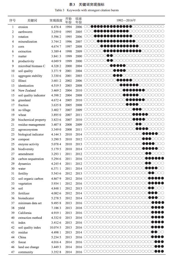 突現(xiàn)性反映了文獻在一定時期被引頻次的增長情況,突現(xiàn)性越大,說明被引頻次增長越快。44 篇文獻中有3 篇文獻的突現(xiàn)性顯著高于其他文獻。Doran 等(突現(xiàn)性40.57) 第一次將土壤質量比較系統(tǒng)地展現(xiàn)在人們眼前,并分別就其概念、評價框架、應用以及生物重要性進行了系統(tǒng)的論述,這在土壤質量概念還不被廣泛接受的時期極大地推動了該領域的發(fā)展。而Karlen 等又在此基礎上將土壤質量進行了完善;Gil-sotres 等詳細論述了土壤質量生物指標的選取以及所面臨的問題,為未來利用土壤生物指標評價土壤質量提出了發(fā)展方向。