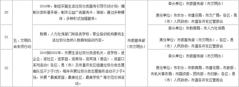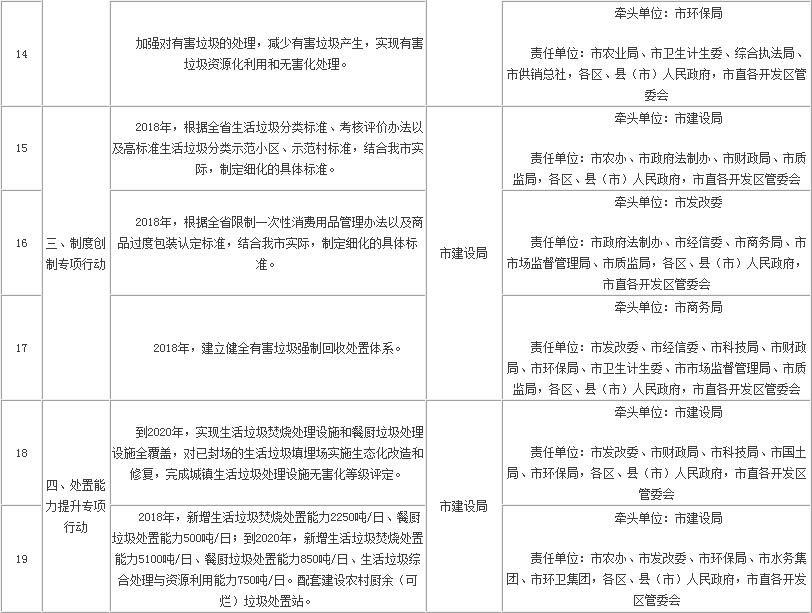 (一)一年細(xì)分目標(biāo)。2018年,全市生活垃圾增長(zhǎng)率控制在2.5%以下;市區(qū)城區(qū)、縣(市)城區(qū)和農(nóng)村分類覆蓋面分別達(dá)到80%、60%和75%;全市黨政機(jī)關(guān)和企事業(yè)單位實(shí)施強(qiáng)制分類覆蓋面達(dá)到100%,全市城區(qū)社會(huì)組織、公共場(chǎng)所和相關(guān)企業(yè)實(shí)施強(qiáng)制分類覆蓋面達(dá)到80%;新增生活垃圾焚燒穩(wěn)定運(yùn)行處置能力2250噸/日、餐廚垃圾處置能力500噸/日;新增省級(jí)高標(biāo)準(zhǔn)生活垃圾分類示范小區(qū)、示范村各25個(gè);初步建立全市再生資源回收利用網(wǎng)絡(luò),其中培育回收骨干企業(yè)8家;完成城區(qū)范圍內(nèi)不符合規(guī)范要求的生活垃圾清運(yùn)車輛和中轉(zhuǎn)站整治改造;市、縣兩級(jí)初步建立生活垃圾分類處理智能化大數(shù)據(jù)平臺(tái);城鄉(xiāng)生活垃圾分類投放正確率穩(wěn)步提升,回收利用率、資源化利用率、無(wú)害化處理率分別達(dá)到30%以上、80%以上、100%。