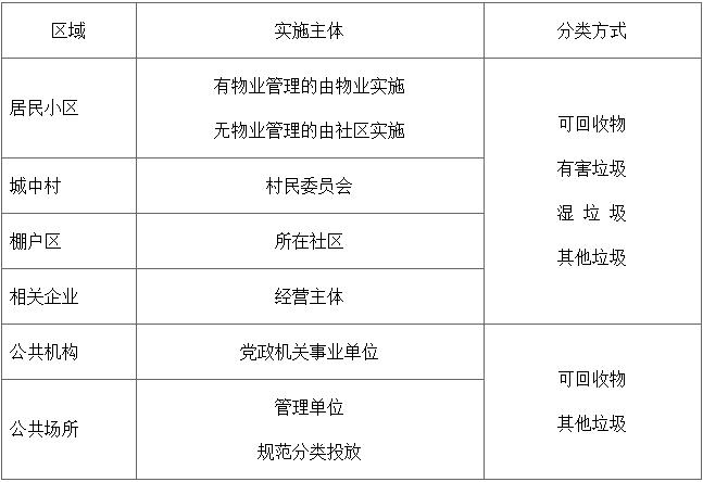居民小區(qū):有物業(yè)管理的由物業(yè)單位配齊分類(lèi)收集容器,沒(méi)有物業(yè)管理的由社區(qū)負(fù)責(zé)配齊。由社區(qū)向居民免費(fèi)提供家用分類(lèi)垃圾袋。新建小區(qū)必須配建分類(lèi)收集點(diǎn)或垃圾房,新建大型小區(qū)必須配建生活垃圾分類(lèi)中轉(zhuǎn)站。