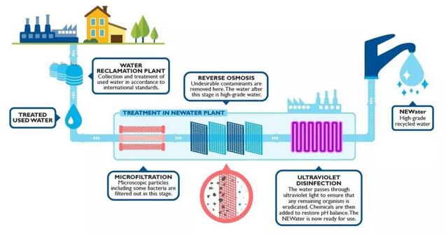 NEWater是指城市污水經(jīng)過常規(guī)二級處理后,再經(jīng)過反滲透處理等工藝所獲得的達到飲用水標準的新生水。