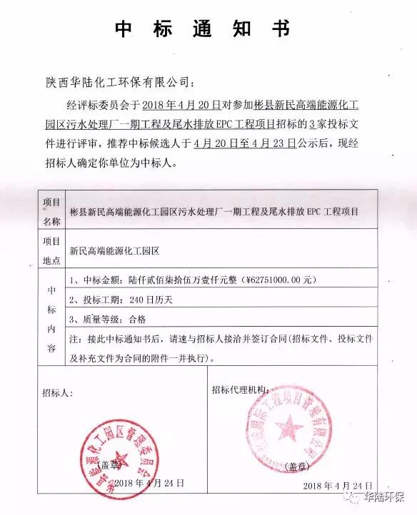 2018年4月24日,陜西華陸化工環(huán)保有限公司成功中標(biāo)彬縣新民高端能源化工園區(qū)污水處理廠一期工程及尾水排放EPC工程項(xiàng)目(以下簡(jiǎn)稱:中標(biāo)項(xiàng)目),中標(biāo)金額為6275.1萬元。
