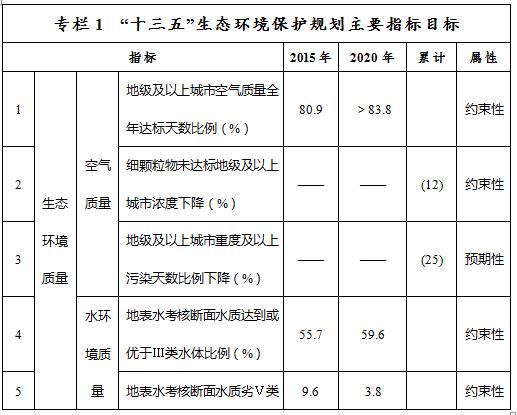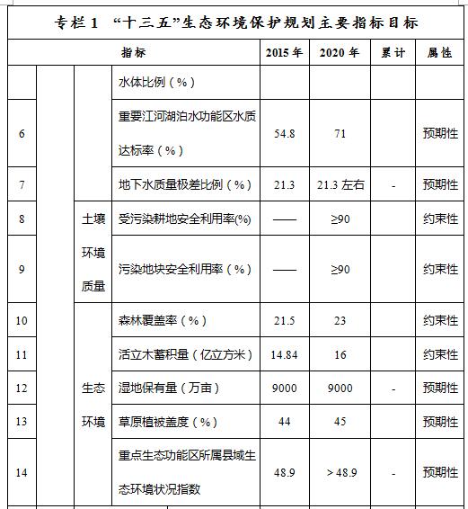 ——環(huán)境質(zhì)量控制目標指標。到2020年,大氣環(huán)境質(zhì)量方面,地級及以上城市空氣質(zhì)量全年達標天數(shù)比例平均達到83.8%以上,重度及以上污染天數(shù)比例下降25%,未達標地級及以上城市PM2.5年均濃度下降12%。水環(huán)境質(zhì)量方面,全區(qū)地表水質(zhì)量考核斷面水質(zhì)達到或優(yōu)于Ⅲ類比例總體達到59.6%,劣Ⅴ類水質(zhì)比例控制在3.8%,重要江河湖泊水功能區(qū)水質(zhì)達標率達到71%,全區(qū)地下水質(zhì)量考核點位水質(zhì)級別保持穩(wěn)定且極差比例控制在21.3%。土壤環(huán)境質(zhì)量方面,全區(qū)土壤環(huán)境質(zhì)量總體保持穩(wěn)定,農(nóng)用地和建設(shè)用地土壤環(huán)境安全得到基本保障,受污染耕地安全利用率和污染地塊安全利用率均達到90%以上。生態(tài)環(huán)境質(zhì)量方面,森林覆蓋率達23%,活立木蓄積量達16億立方米,濕地保有量達9000萬畝,草原植被蓋度達到45%,重點生態(tài)功能區(qū)所屬縣域生態(tài)環(huán)境狀況指數(shù)達到48.9以上。