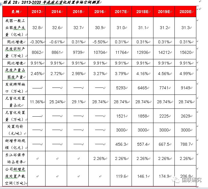 無害化處置市場(chǎng)潛力巨大,公司成長(zhǎng)空間廣闊。我們預(yù)計(jì)在2018-2020年,全國(guó)危廢實(shí)際產(chǎn)量將會(huì)持續(xù)增長(zhǎng),約為1.3-1.56億噸,截至2016年底,全國(guó)各省(區(qū)、市)頒發(fā)的危廢(包含醫(yī)療廢物)經(jīng)營(yíng)許可證共計(jì)2195份,核準(zhǔn)經(jīng)營(yíng)規(guī)模為6471萬噸/年(含收集經(jīng)營(yíng)規(guī)模397萬噸/年)。我們通過測(cè)算未來危廢實(shí)際產(chǎn)量與現(xiàn)有核準(zhǔn)規(guī)模的缺口,按無害化處置比例28.74%,3000元/噸的平均處置價(jià)格進(jìn)行測(cè)算,則預(yù)計(jì)到2020年,危廢無害化處置行業(yè)缺口將有望達(dá)到788.7億元。對(duì)于東江環(huán)保,2016、2017年危廢處置總產(chǎn)能分別為146萬噸、160萬噸,按照16年核準(zhǔn)經(jīng)營(yíng)規(guī)模6471萬噸/年進(jìn)行計(jì)算,市場(chǎng)占有率在2.26%,假設(shè)市占率保持不變,對(duì)應(yīng)的公司2020年新增危廢處置總產(chǎn)能的空間(包含資源化、無害化)大約是206.8萬噸,合計(jì)總產(chǎn)能規(guī)模達(dá)到352.8萬噸,較目前公司的產(chǎn)能規(guī)模160萬噸仍有較大的增長(zhǎng)空間。