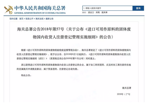 6月15日,海關總署發(fā)布今年第57號文件,根據《進口可用作原料的固體廢物檢驗檢疫監(jiān)督管理辦法》,海關總署制定了《進口可用作原料的固體廢物國內收貨人注冊登記管理實施細則》,現予以公告,自2018年8月1日起執(zhí)行?!哆M口可用作原料的固體廢物國內收貨人注冊登記管理實施細則(試行)》(原質檢總局公告2009年第91號公布)同時廢止。