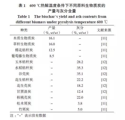 同樣的熱解溫度條件下,不同的炭化材料制備的生物質(zhì)炭性質(zhì)不同。600 ℃條件制備的木質(zhì)生物質(zhì)炭、草稈生物質(zhì)炭、棉花秸稈生物質(zhì)炭和葡萄藤生物質(zhì)炭產(chǎn)量相比,木質(zhì)生物質(zhì)炭和草稈生物質(zhì)炭的產(chǎn)量16.1%(wt/wt)較高,而葡萄藤生物質(zhì)炭的產(chǎn)量8.5%(wt/wt)較低(表1)。生物質(zhì)炭的產(chǎn)量指風(fēng)干生物質(zhì)熱解炭化后的干重,主要與生物質(zhì)中的纖維素和木質(zhì)素含量有關(guān)。同樣的溫度條件下,不同來(lái)源生物質(zhì)炭的灰分含量變化較大,秸稈類生物質(zhì)炭的灰分含量較高22.2%~35.1%(wt/wt),而木炭和竹炭的灰分含量較低3.8%~5.0% (wt/wt)。一般來(lái)說(shuō),木本科的生物質(zhì)炭含碳量較高,礦質(zhì)養(yǎng)分較少;畜禽糞便和草本植物生產(chǎn)的生物質(zhì)炭含碳量較低,礦質(zhì)元素含量較高。