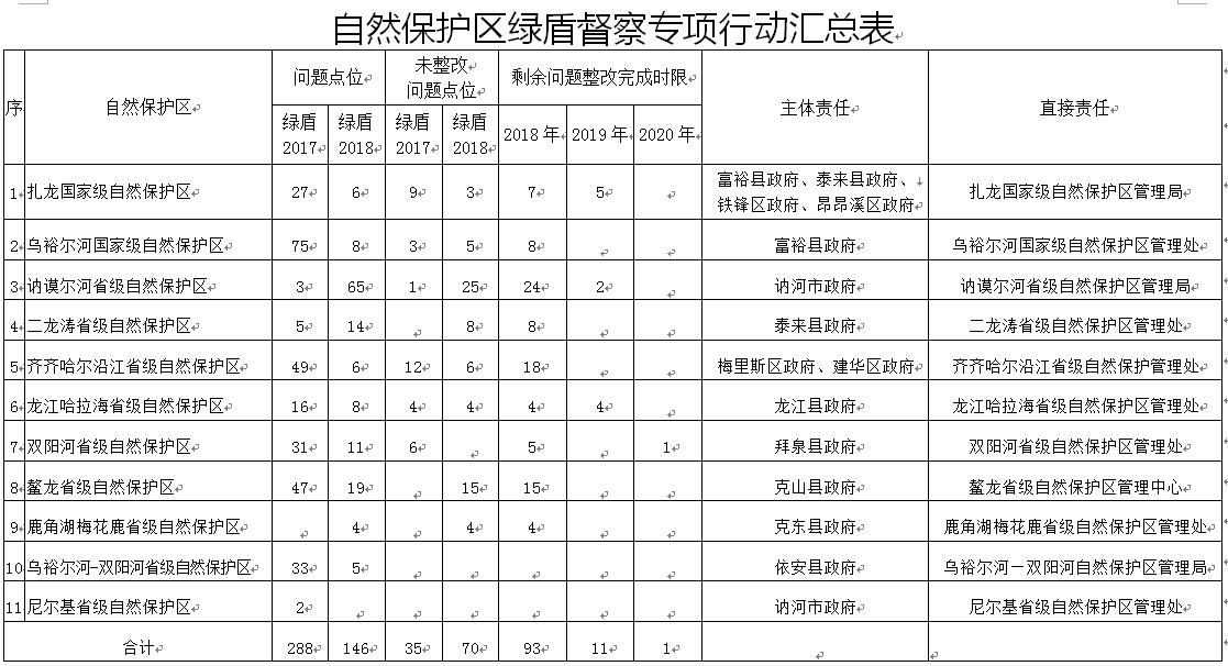1.深入開展自然保護(hù)區(qū)綠盾督察專項行動問題整改。截至2018年6月13日,“綠盾2017”專項行動確定問題點(diǎn)位288個,已完成整改253個;“綠盾2018”專項行動確定問題點(diǎn)位146個,已完成整改76個;綜合整改率75.8%。各責(zé)任單位要在已建立問題臺賬清單基礎(chǔ)上,對突出問題再梳理,堅持整改原則,限期分類處置。要嚴(yán)格整改標(biāo)準(zhǔn),對于事實清楚、查處依據(jù)充分的問題迅速行動、立行立改;對于暫不能完成的問題制定臺賬和整改措施,明確整改時限,實行整改包保制,拉條掛賬、跟蹤問效、督辦落實、辦結(jié)銷號,將問題堅決整改到位。剩余105個未完成整改的問題點(diǎn)位,2018年完成整改93個,綜合整改率達(dá)到97.2%;2019年完成整改11個,綜合整改率達(dá)到99.8%;2020年完成整改1個,綜合整改率達(dá)到100%。(責(zé)任單位:訥河市政府、龍江縣政府、富裕縣政府、泰來縣政府、拜泉縣政府、克山縣政府、克東縣政府、依安縣政府、甘南縣政府、昂昂溪區(qū)政府、梅里斯區(qū)政府、鐵鋒區(qū)政府、建華區(qū)政府、扎龍國家級自然保護(hù)區(qū)管理局、省農(nóng)墾總局九三管理局)