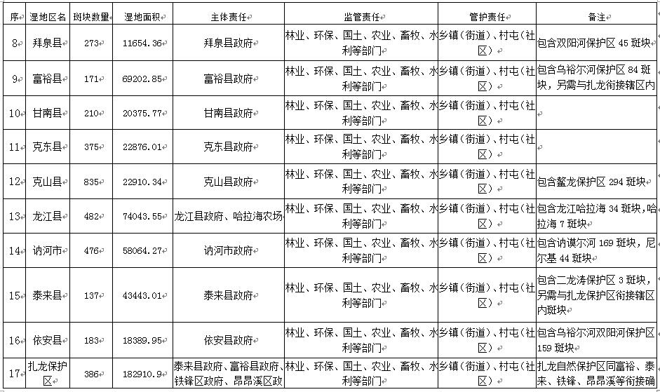 2.明確濕地斑塊管護(hù)責(zé)任。以濕地斑塊為單元,把濕地斑塊管護(hù)責(zé)任落實到鄉(xiāng)鎮(zhèn)(街道)、村屯(社區(qū)),所有濕地斑塊明確管護(hù)責(zé)任人,建立完善鄉(xiāng)鎮(zhèn)(街道)、村屯(社區(qū))管護(hù)責(zé)任機(jī)制。按照《黑龍江省濕地保護(hù)修復(fù)工作實施方案》要求,在列入名錄中的濕地的顯著位置樹立濕地標(biāo)示牌,標(biāo)明濕地面積、級別、類型、四至范圍、主管部門和管護(hù)責(zé)任人等內(nèi)容。此項工作2019年底前完成?!藏?zé)任單位:各縣(市)區(qū)政府、扎龍國家級自然保護(hù)區(qū)管理局、省農(nóng)墾總局九三管理局〕