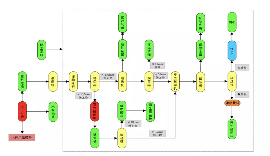 據(jù)介紹,該項目位于浙江某地,于2018年年初成功運行,設(shè)計處理產(chǎn)量每天處理300噸裝修垃圾,包括居民家庭裝修垃圾、商業(yè)辦公裝修垃圾、會展搭建垃圾等,經(jīng)破碎、分選后,回收金屬、木材、RDF(可用于焚燒發(fā)電)和渣土原材料等各類可再生資源。