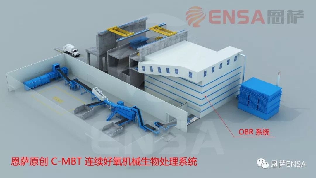 為解決上述問題,恩薩原創(chuàng)性地提出大規(guī)模智能連續(xù)好氧機(jī)械生物處理技術(shù)(以下簡稱“C-MBT”,即:Continuous Mechanical Biological Treatment),即采用 OBR 連續(xù)高效好氧生物反應(yīng)器(恩薩專利)技術(shù)(以下簡稱“OBR”, 即:Oxic Bio-Reactor ),針對已經(jīng)過初步破碎預(yù)處理后的生活垃圾等物料,在封閉的環(huán)境下,以連續(xù)進(jìn)出料和自動翻拋的方式持續(xù)好氧發(fā)酵的過程,從而在相對較短的發(fā)酵時間內(nèi)持續(xù)獲得較低含水率的高熱值物料。