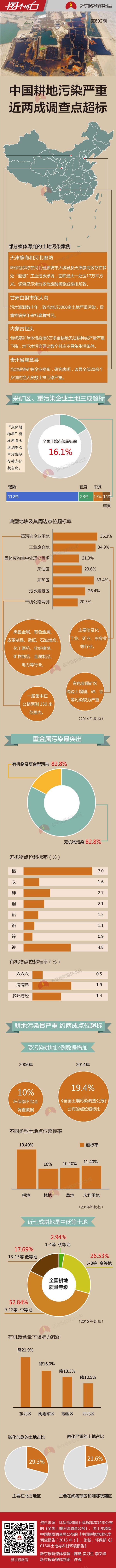 中國土壤污染問題有多嚴(yán)重?目前能找到的最權(quán)威、最全面的數(shù)據(jù)來自2014年環(huán)保部和國土資源部共同發(fā)布的《全國土壤污染狀況調(diào)查公報》。數(shù)據(jù)顯示,全國土壤總的超標(biāo)率為 16.1%,其中最嚴(yán)重的耕地,調(diào)查點(diǎn)位超標(biāo)達(dá)到19.4%。