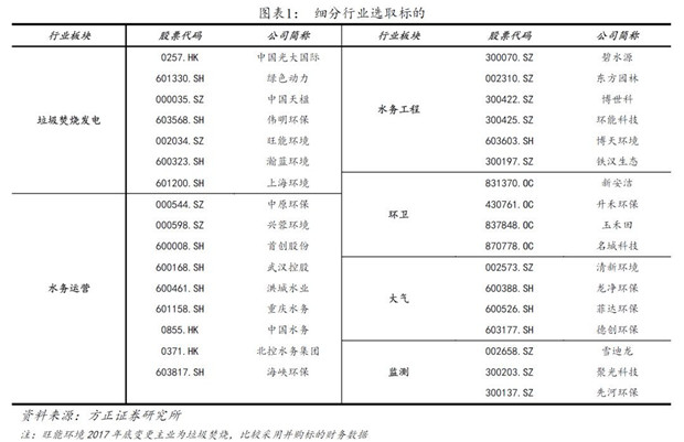 我們選取了垃圾焚燒發(fā)電、水務(wù)運(yùn)營(yíng)、水務(wù)工程、環(huán)衛(wèi)、大氣和監(jiān)測(cè)6個(gè)細(xì)分領(lǐng)域內(nèi)的代表性上市公司,通過這些上市公司的2017年年報(bào)財(cái)務(wù)數(shù)據(jù)計(jì)算細(xì)分行業(yè)指標(biāo)進(jìn)行比較。