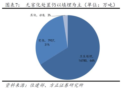 細(xì)分來看,無(wú)害化處置中填埋、焚燒、其他方式年處置量分別為1.68億噸、0.80億噸、0.06億噸,占比分別為66%、31%和2%,衛(wèi)生填埋仍然是無(wú)害化處置的主流方式。