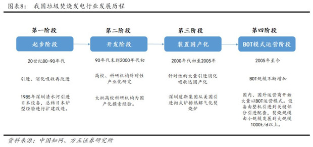 我國(guó)垃圾焚燒發(fā)電行業(yè)起步于20世80年代末,通過引進(jìn)國(guó)外先進(jìn)的焚燒設(shè)備和技術(shù),消化吸收優(yōu)化,先后經(jīng)歷了產(chǎn)業(yè)化研發(fā)、裝置國(guó)產(chǎn)化等階段。