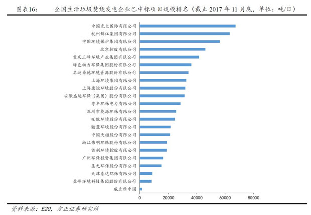 根據(jù)E20研究院統(tǒng)計(jì)排名,截止2017年11月底,已中標(biāo)的垃圾焚燒發(fā)電項(xiàng)目規(guī)模前五企業(yè)項(xiàng)目規(guī)模占比達(dá)到 42.26%,規(guī)模前十企業(yè)項(xiàng)目規(guī)模占比達(dá)到67.86%,行業(yè)市場(chǎng)集中度較高。