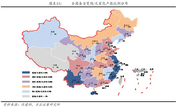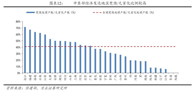 從焚燒處理占無(wú)害化產(chǎn)能比例來看,2016年全國(guó)焚燒處理占無(wú)害化處理比例為41%,全國(guó)有14個(gè)省焚燒處理占無(wú)害化處理比例超過該比例,且大多分布在中東部經(jīng)濟(jì)發(fā)展程度較高的地區(qū),其中浙江省焚燒處理占無(wú)害化處理比例最高,達(dá)到了71%。