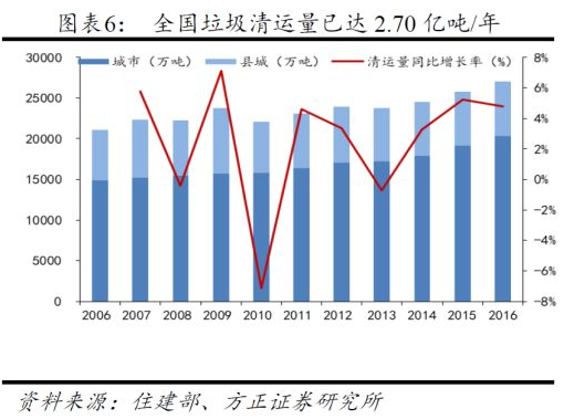 從生活垃圾產(chǎn)量角度,隨著我國(guó)城鎮(zhèn)化進(jìn)程的推進(jìn),城市生活垃圾清運(yùn)量逐年增長(zhǎng),2016年生活垃圾清運(yùn)量已經(jīng)達(dá)到2.70億噸,其中城市生活垃圾清運(yùn)量2.03億噸,縣城生活垃圾清運(yùn)量0.67億噸,并在以每年4%-5%的增速逐年攀升。