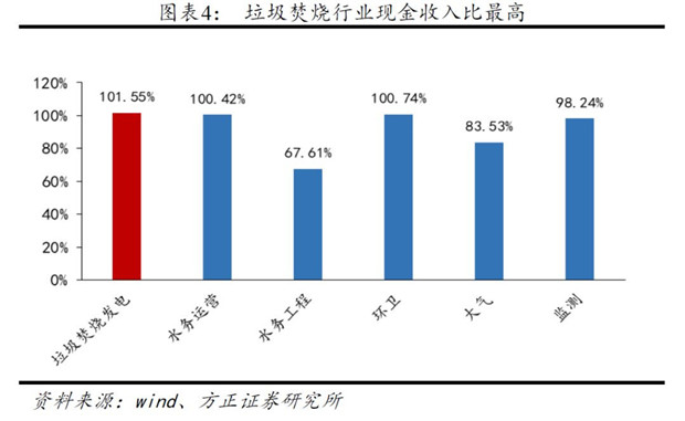 從現(xiàn)金收入比來看,2017年垃圾焚燒發(fā)電現(xiàn)金收入比101.55%,高于其他細(xì)分行業(yè),表現(xiàn)出運(yùn)營(yíng)類業(yè)務(wù)良好的現(xiàn)金流情況。