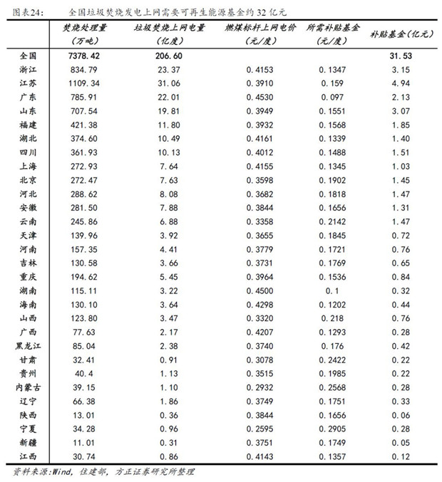 • 按照2016年各省垃圾焚燒處置量,噸垃圾上網(wǎng)電量280度測(cè)算,全國(guó)垃圾焚燒發(fā)電上網(wǎng)需要可再生能源基金約32億元。