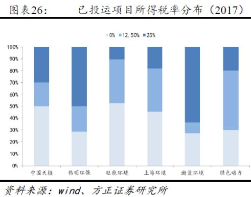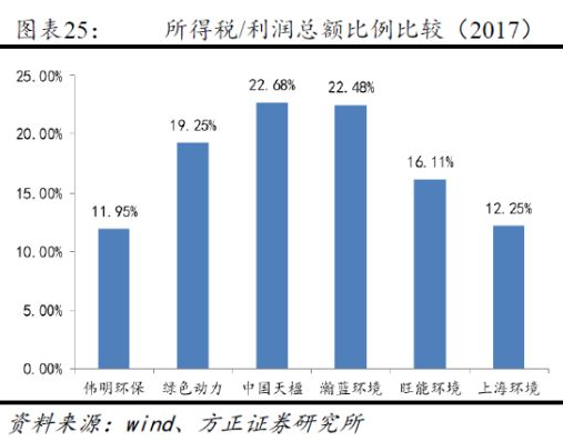因此,根據(jù)項(xiàng)目投運(yùn)時(shí)間不同,各公司的所得稅率存在一定差異。我們比較了6家上市公司合并報(bào)表層面的所得稅/利潤(rùn)總額比例,其中偉明環(huán)保最低,為11.95%,主要是由于新投運(yùn)的永強(qiáng)二期項(xiàng)目貢獻(xiàn)凈利潤(rùn)較多;中國(guó)天楹最高,為22.68%,公司海外子公司的所得稅率較高所致。