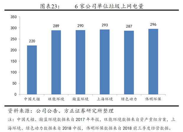 行業(yè)平均噸垃圾發(fā)電量為280-400度,其中自用電比例約20%,單位垃圾上網(wǎng)電量約220-300度,不同項(xiàng)目間差異性較大。我們根據(jù)已披露的公開信息得到部分公司單位垃圾發(fā)電量數(shù)據(jù):