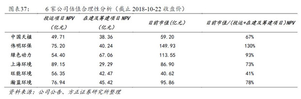 通過(投運(yùn)項(xiàng)目+在建及籌建項(xiàng)目)NPV/目前市值指標(biāo)來衡量上市公司目前市值的合理水平。垃圾焚燒項(xiàng)目估值由高到低依次為偉明環(huán)保、綠色動(dòng)力、瀚藍(lán)環(huán)境、上海環(huán)境、中國(guó)天楹、旺能環(huán)境。