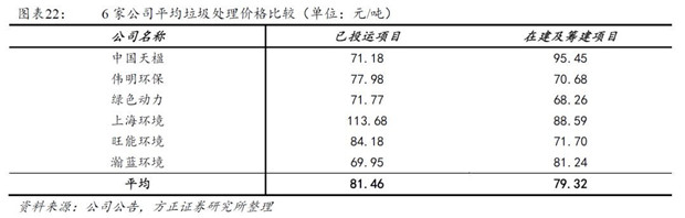 我們根據(jù)上市公司公開披露的項(xiàng)目信息統(tǒng)計(jì),取各個(gè)項(xiàng)目垃圾處置價(jià)格的平均值,對(duì)6家A股上市公司進(jìn)行比較。已投運(yùn)項(xiàng)目平均處置價(jià)格81元/噸,在建及籌建項(xiàng)目平均處置價(jià)格79元/噸,行業(yè)競(jìng)爭(zhēng)激烈導(dǎo)致行業(yè)整體垃圾處置價(jià)格有所下降。