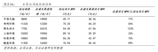 通過在建及籌建項(xiàng)目NPV/已投運(yùn)項(xiàng)目NPV的指標(biāo)來表現(xiàn)公司成長(zhǎng)性,成長(zhǎng)性由高到低依次為:綠色動(dòng)力、中國(guó)天楹、旺能環(huán)境、偉明環(huán)保、瀚藍(lán)環(huán)境、上海環(huán)境。