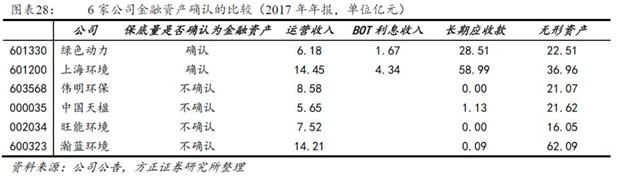 6家上市公司中,綠色動(dòng)力、上海環(huán)境將保底垃圾處置費(fèi)確認(rèn)為金融資產(chǎn)-長(zhǎng)期應(yīng)收款,建設(shè)投資剩余部分確認(rèn)為無(wú)形資產(chǎn)-特許經(jīng)營(yíng)權(quán);而偉明環(huán)保、中國(guó)天楹、旺能環(huán)境、瀚藍(lán)環(huán)境將全部建設(shè)投資轉(zhuǎn)入無(wú)形資產(chǎn)。