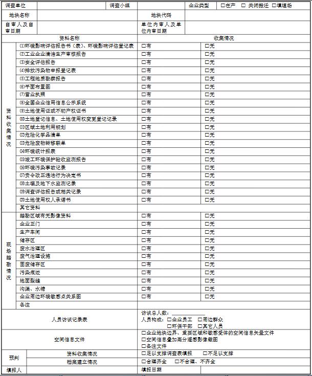 質(zhì)控人員查看地塊基本資料和輔助資料的收集情況、現(xiàn)場踏勘照片、人員訪談記錄、地塊信息檔案情況和空間信息文件等資料,并填寫地塊調(diào)查表填報支撐材料情況(附錄 1),初步評判資料收集