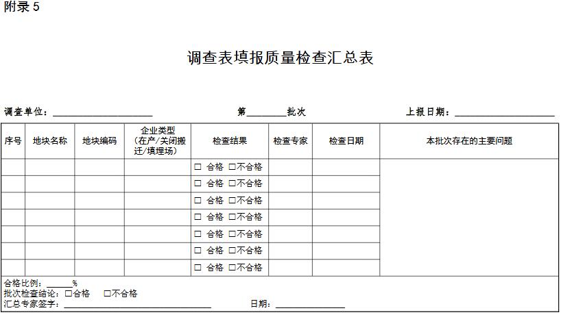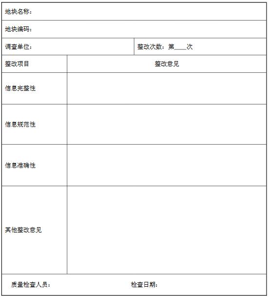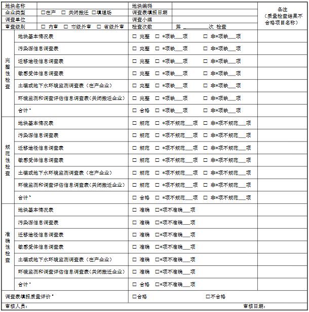 注: a:信息完整性檢查:若帶“*”的未填項數(shù)超過 2 個或不帶“*”的未填項數(shù)超過 5 個,則判定為信息完整性檢查不合格;b:信息規(guī)范性檢查:若帶“*”的不規(guī)范填報項數(shù)超過 2 個或不帶“*”的不規(guī)范填報項數(shù)超過 5 個,則判定為信息規(guī)范性檢查不合格;c:信息準(zhǔn)確性檢查:當(dāng)*項不準(zhǔn)確填報項數(shù)超過 2 個,則判定為信息準(zhǔn)確性檢查不合格;d:調(diào)查表填報質(zhì)量評價:完整性、規(guī)范性、準(zhǔn)確性三者有一項不合格則判定該地塊調(diào)查表填報為不合格;若三項均合格,統(tǒng)計調(diào)查表中帶“*”的未填信息項、不規(guī)范信息項和不準(zhǔn)確信息項總數(shù),超過 5 個則判定為調(diào)查表填報質(zhì)量不合格。對不合格調(diào)查表需出具整改意見單。