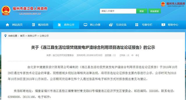 2018年10月30日,福州市連江經(jīng)濟(jì)開發(fā)區(qū)管委會(huì)公示《連江縣生活垃圾焚燒發(fā)電爐渣綜合利用項(xiàng)目選址論證報(bào)告》。