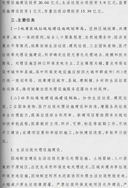《方案》提出,要根據(jù)人口聚集程度、自然地理條件、經(jīng)濟發(fā)展水平等情況統(tǒng)籌規(guī)劃布局垃圾處理設施建設;要補齊垃圾處理設施建設短板,到2019年底,新建生活垃圾無害化處理設施76座,完成無害化處理設施改擴建43個和存量垃圾治理項目62個。