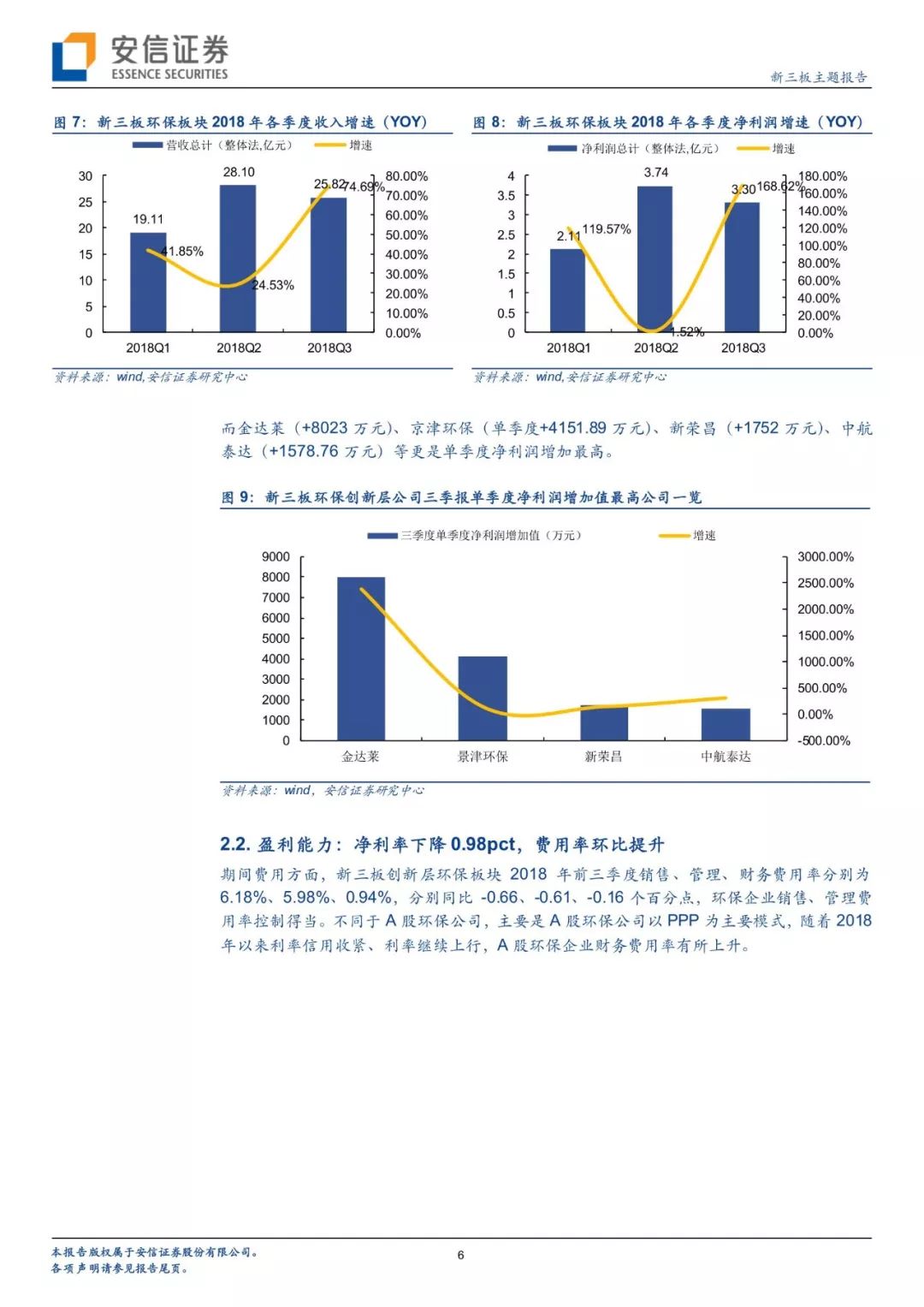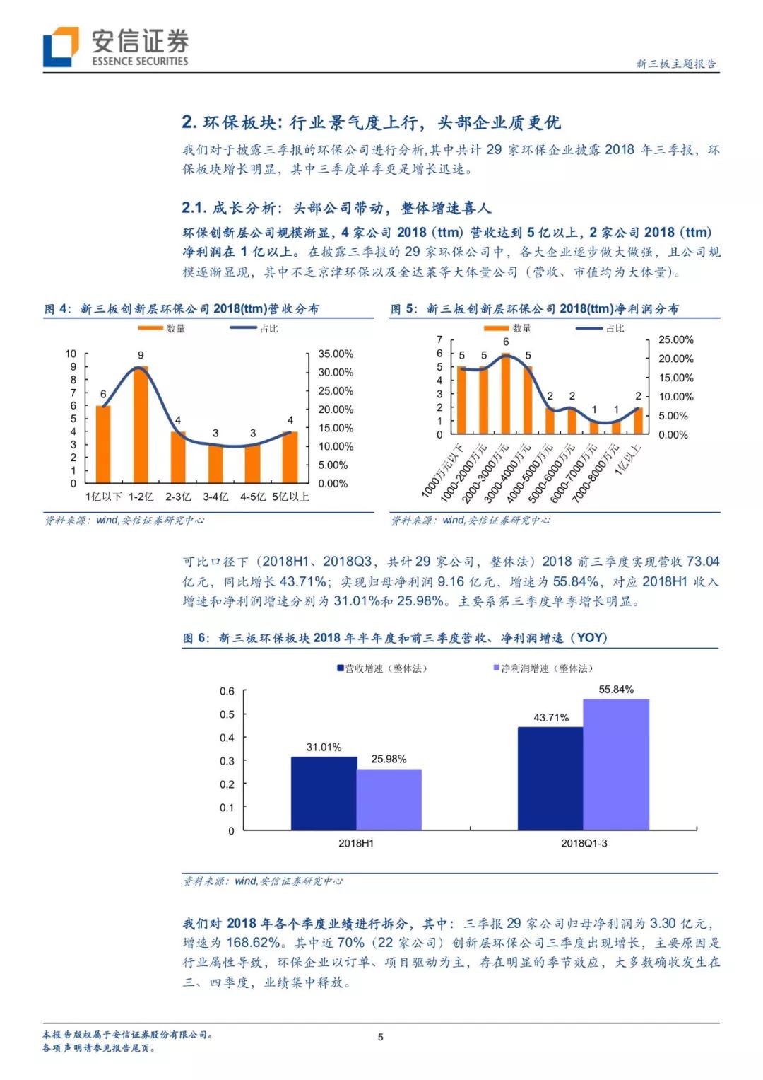 成長分析:可比口徑下,2018前三季度實現(xiàn)營收73.04億元(+43.71%);實現(xiàn)歸母凈利潤9.16億元(+55.84%),增速高于半年報。主要原因是環(huán)保創(chuàng)新層公司第三季度單季增長明顯(凈利潤增長168.62%)。且環(huán)保創(chuàng)新層公司多為各細分行業(yè)的龍頭,近70%環(huán)保公司實現(xiàn)增長,4家2018(ttm)凈利潤在5億元以上,規(guī)模逐漸顯現(xiàn),其中不乏京津環(huán)保以及金達萊等大體量公司。